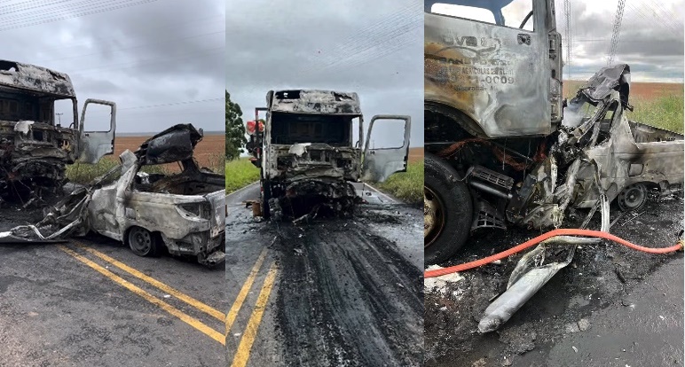Com o impacto, houve incêndio no veículo de passeio, que ficou completamente destruído. O caminhão foi parcialmente atingido, enquanto a carga teve apenas danos leves, de acordo com a corporação.
