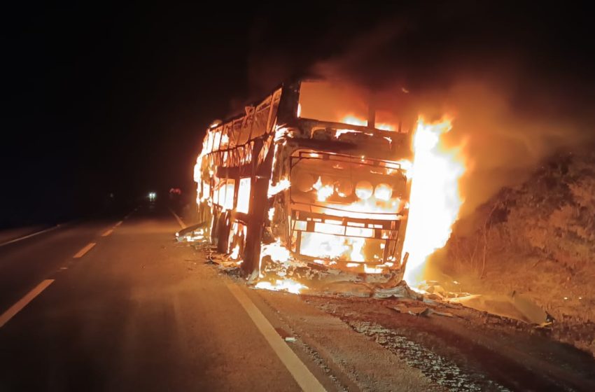 Um ônibus interestadual pegou fogo na noite da última terça-feira (6), por volta das 23h37, na rodovia MGC-122, nas proximidades