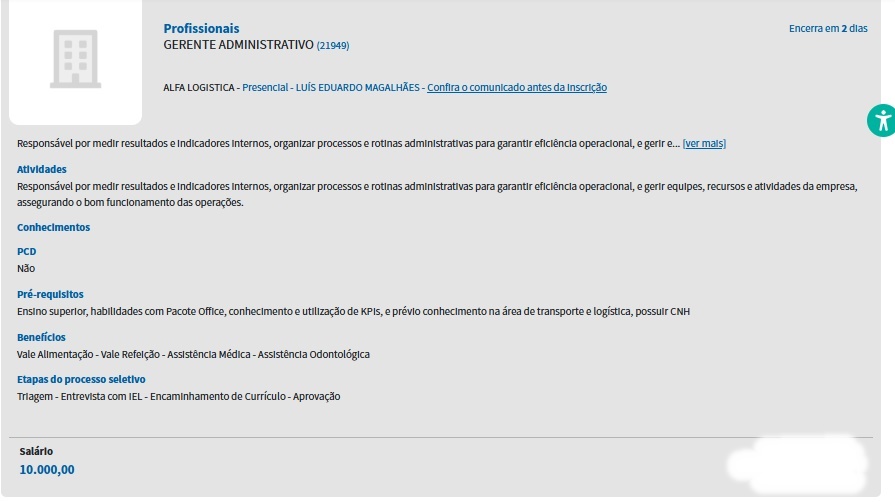 Na plataforma do IEL, duas oportunidades de emprego foram anunciadas pela empresa Alfa Logística, em regime presencial, no município de Luís Eduardo Magalhães, Oeste da Bahia. As inscrições ficam abertas por mais dois dias e devem ser realizadas exclusivamente pela internet, no site oficial do IEL/BA.
