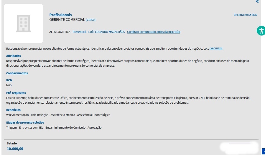 A segunda oportunidade é para Gerente Comercial, destinada a profissionais com perfil estratégico, capacidade de decisão e habilidade para identificar e desenvolver projetos comerciais que ampliem oportunidades de negócio. Os benefícios e requisitos são semelhantes aos da vaga administrativa. O salário é também de R$ 10 mil.