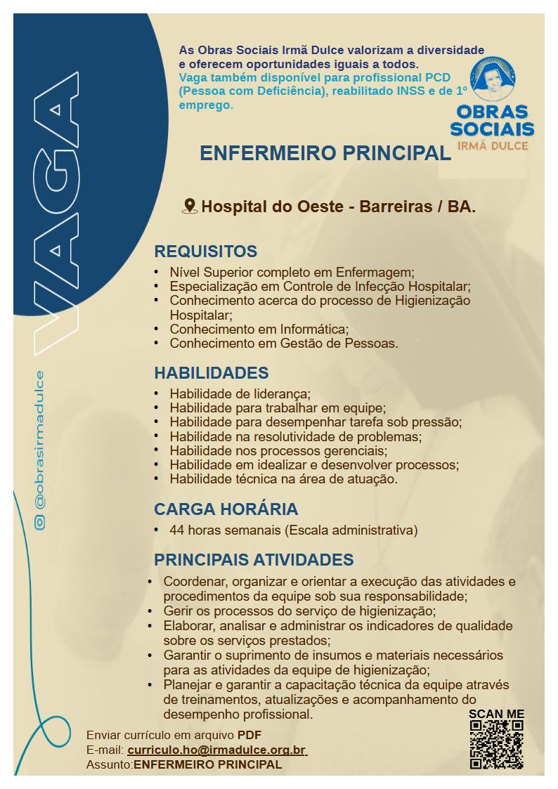O Hospital do Oeste (HO), em Barreiras, no oeste da Bahia, está com vaga de emprego para enfermeiro principal, reforçando o atendimento à população regional. A unidade é administrada pelas Obras Sociais Irmã Dulce (OSID) e busca profissional com perfil de liderança e experiência em enfermagem hospitalar.