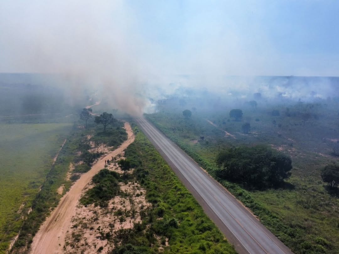 O incêndio, que se alastrou por mais de um quilômetro de extensão, provocou uma intensa coluna de fumaça, comprometendo a visibilidade e aumentando significativamente o risco de acidentes para os motoristas que trafegam pela rodovia.