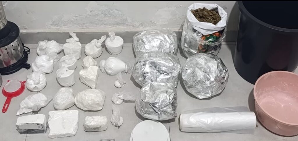 No local, foram apreendidas porções de cocaína e maconha, além de balanças de precisão, utensílios usados na preparação das drogas e um liquidificador industrial.