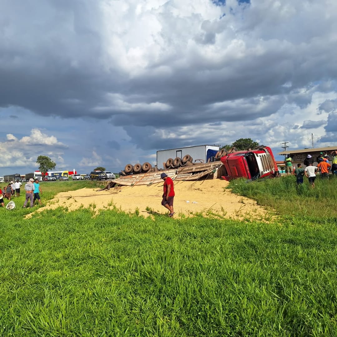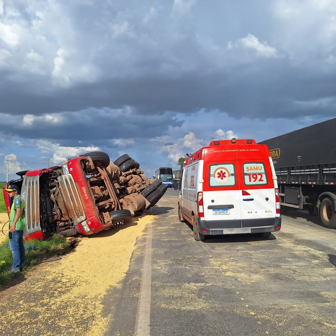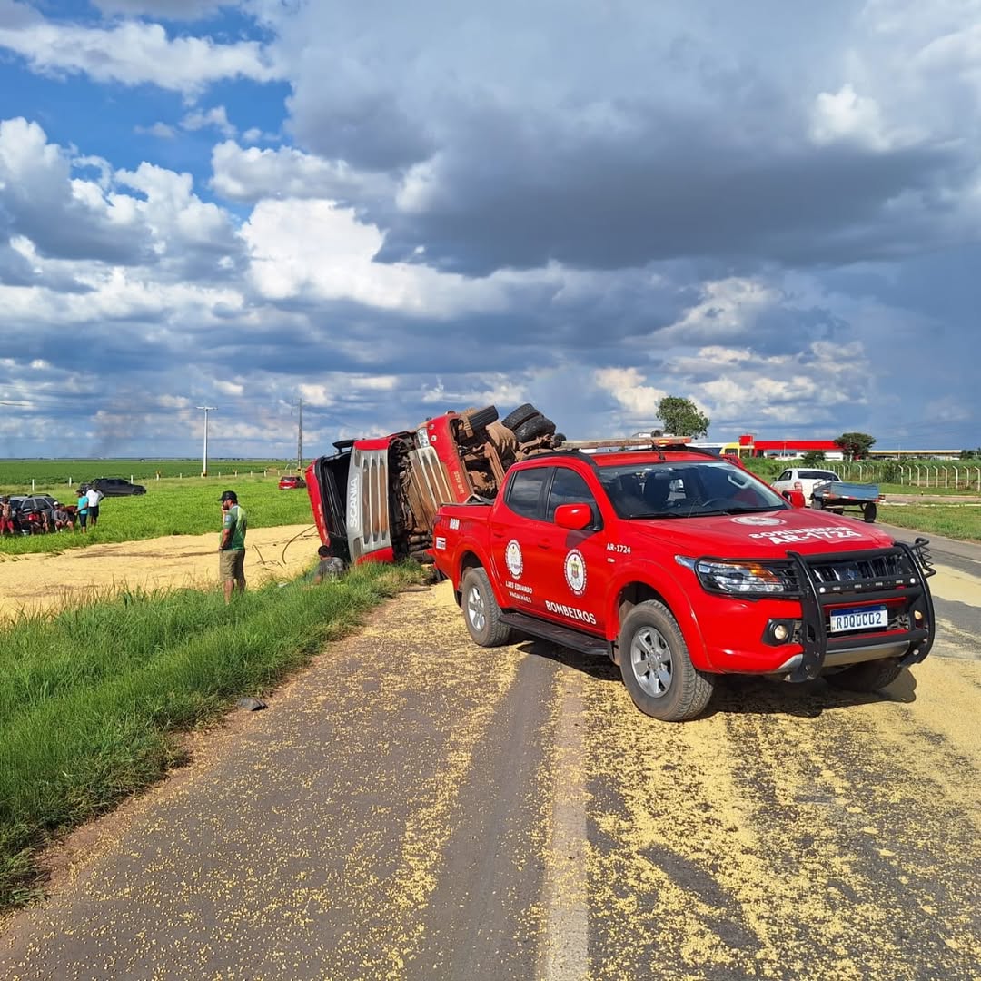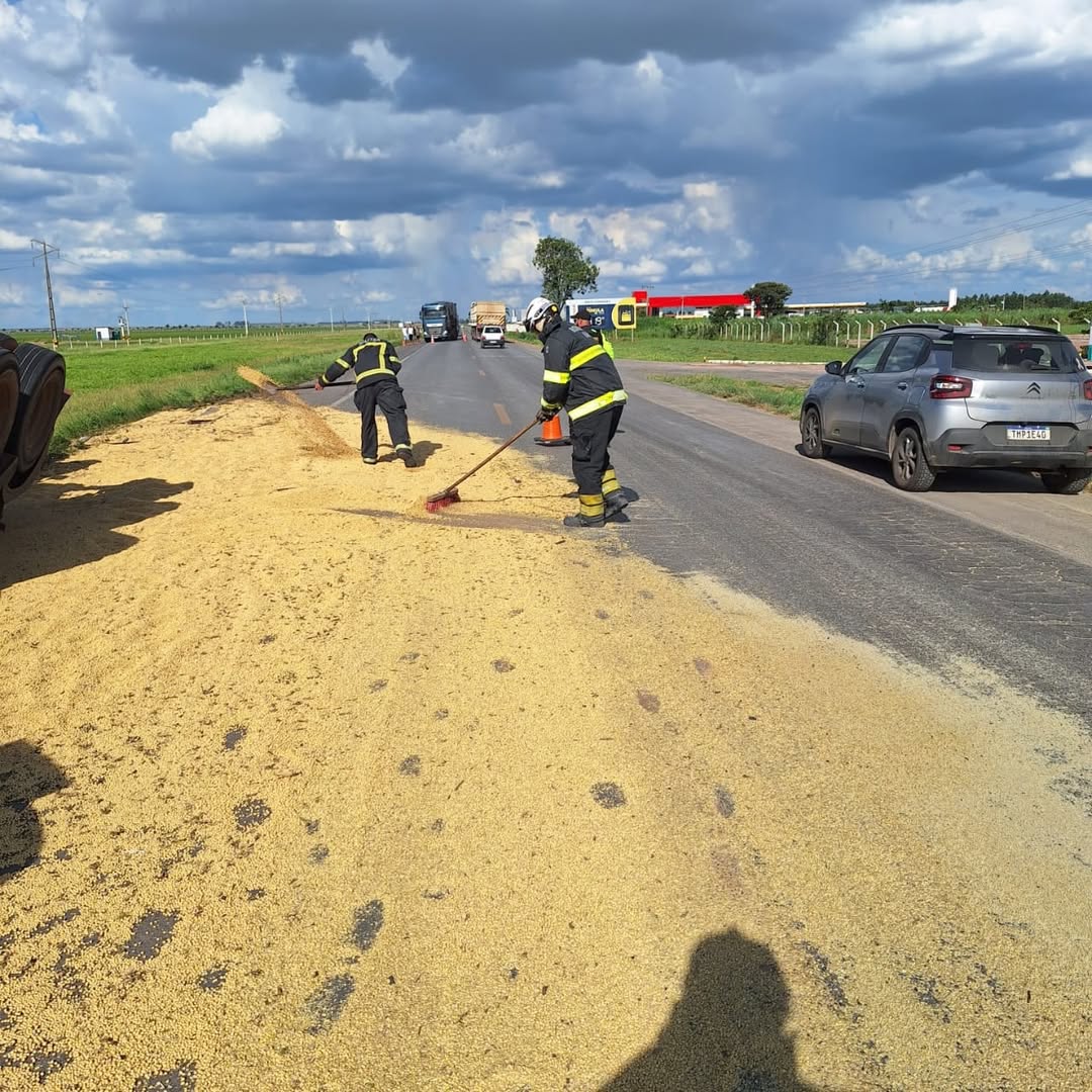 Ao chegar ao local, a guarnição constatou que um dos veículos envolvidos havia tombado às margens da rodovia, espalhando grãos de soja pelo acostamento. O conjunto era composto por um caminhão-trator Scania, que tracionava um semirreboque carregado.